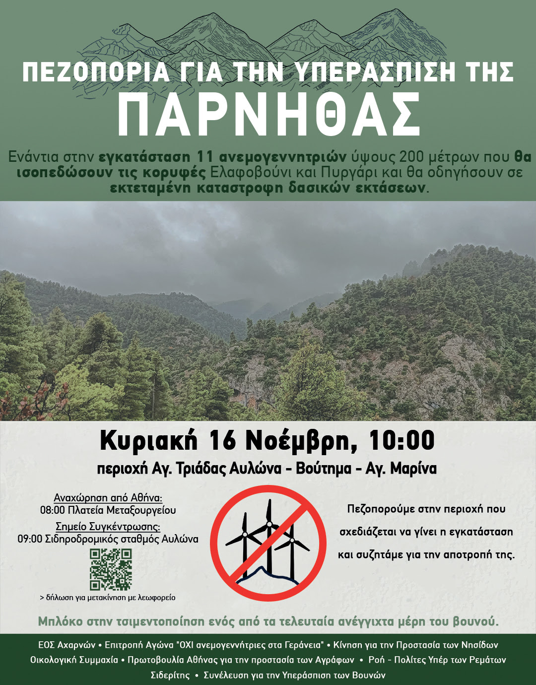 Κυριακή 16 Νοέμβρη 2025: Πεζοπορία στην περιοχή εγκατάστασης νέων Α/Γ Η Ροή συνδιοργανωτής των δράσεων για την υπεράσπιση της Πάρνηθας! Ενάντια στην εγκατάσταση 11 ανεμογεννητριών ύψους 200 μέτρων που θα οδηγήσουν σε εκτεταμένη καταστροφή δασικών εκτάσεων. Πεζοπορούμε στην περιοχή που σχεδιάζεται να γίνει η εγκατάσταση και συζητάμε για την αποτροπή της με προσφυγή στο Συμβούλιο της Επικρατείας. Η Πάρνηθα, ο τελευταίος μεγάλος πνεύμονας της Αττικής, απειλείται ξανά. Στις 8/9/2025 εγκρίθηκε η εγκατάσταση νέου αιολικού σταθμού της AIR ENERGY, με 11 τεράστιες ανεμογεννήτριες Siemens Gamesa ύψους 200 μέτρων, στις κορυφές Ελαφοβούνι και Πυργάθι της Βόρειας Πάρνηθας, μέσα σε άθικτο δάσος. Μιλάμε για ένα έργο ισχύος 72,6 MW, που έρχεται να προστεθεί στις 51 ανεμογεννήτριες που ήδη λειτουργούν στη Δυτική Πάρνηθα, ακόμα και μέσα στα καμένα. Η συνεχής εγκατάσταση ανεμογεννητριών στους ορεινούς όγκους : - Αποψιλώνει δάση και κατακερματίζει οικοσυστήματα, - διαλύει το ανάγλυφο και αλλοιώνει το τοπίο, - απειλεί την άγρια ζωή, - μολύνει τα νερά και αλλάζει το μικροκλίμα του βουνού, - μετατρέπει προστατευόμενες περιοχές σε βιομηχανικές ζώνες, με φωτορύπανση και ηχορύπανση και, - μεγαλώνει τον κίνδυνο πρόκλησης πυρκαγιών. Δεν μπορούμε να επιτρέψουμε να χαθεί ένα από τα σημαντικότερα οικοσυστήματα της Αττικής. Για αυτό, οργανώσεις, συλλογικότητες και πολίτες ενώνουμε δυνάμεις, προχωρούμε σε νομικές ενέργειες και σας καλούμε όλες/ους να στηρίξετε μια πεζοπορία που θα δώσει ένα μήνυμα αντίστασης στα σχέδια λεηλασίας του βουνού μας. Μπλόκο στην τσιμεντοποίηση ενός από τα τελευταία ανέγγιχτα μέρη του βουνού. Πρόγραμμα Πεζοπορίας 08:00 - Αναχώρηση πούλμαν από Αθήνα, στις 08:00 από την Πλατεία Μεταξουργείου. 09:00 - Προσυγκέντρωση στο Σιδηροδρομικό Σταθμό Αυλώνα. 10:00 - Εκκίνηση πεζοπορίας (τέρμα ασφάλτου, 1,4 χλμ μετά την Αγία Τριάδα, δίπλα στη μικρή λίμνη). 11:30 - Άφιξη στην Αγία Μαρίνα – διάλειμμα & ομιλίες. 12:30 - Επιστροφή από Αγία Μαρίνα. 14:30 - Τερματισμός – Αναχώρηση πούλμαν & αυτοκινήτων. Θα υπάρχουν δύο οικονομικά πούλμαν από Αθήνα για Πάρνηθα και επιστροφή. Περισσότερες πληροφορίες (κόστος, δηλώσεις συμμετοχής, σημεία επιβίβασης) θα ανακοινωθούν σύντομα. Τι πρέπει να έχετε μαζί σας - Άνετα πεζοπορικά παπούτσια. - Μπουφάν / αντιανεμικό - πιθανό κρύο και αέρας. - Νερό (τουλάχιστον 1/1,5 λίτρο). - Σνακ για τη διαδρομή (ξηροί καρποί, φρούτα, μπάρα κλπ). - Καπέλο ή σκουφί, ανάλογα με τον καιρό. - Γάντια και μαντήλι / buff (προαιρετικά). - Φαρμακείο τσέπης (προαιρετικό). - Αγάπη για τη φύση και αγωνιστικό πνεύμα. Η Πάρνηθα δεν αντέχει άλλη πληγή! Δε θα αφήσουμε να χαθεί το τελευταίο μεγάλο καταφύγιο άγριας φύσης της Αττικής. Η συμμετοχή όλων είναι κρίσιμη για να ενισχυθεί ο αγώνας σε κινηματικό, πολιτικό και νομικό επίπεδο. Διοργανωτές ΕΟΣ Αχαρνών Επιτροπή Αγώνα «ΟΧΙ ανεμογεννήτριες στα Γεράνια» Κίνηση για την Προστασία των Νησίδων Οικολογική Συμμαχία Πρωτοβουλία Αθήνας για την Προστασία των Αγράφων Ροή - Πολίτες υπέρ των Ρεμάτων Σιδερίτης Συνέλευση για την Υπεράσπιση των Βουνών Η Εκδήλωση στο Facebook: https://www.facebook.com/events/1169912501780351?locale=el_GR Πληρ. : 6932 728 025, 6972 911 008 Το Διοικητικό Συμβούλιο |